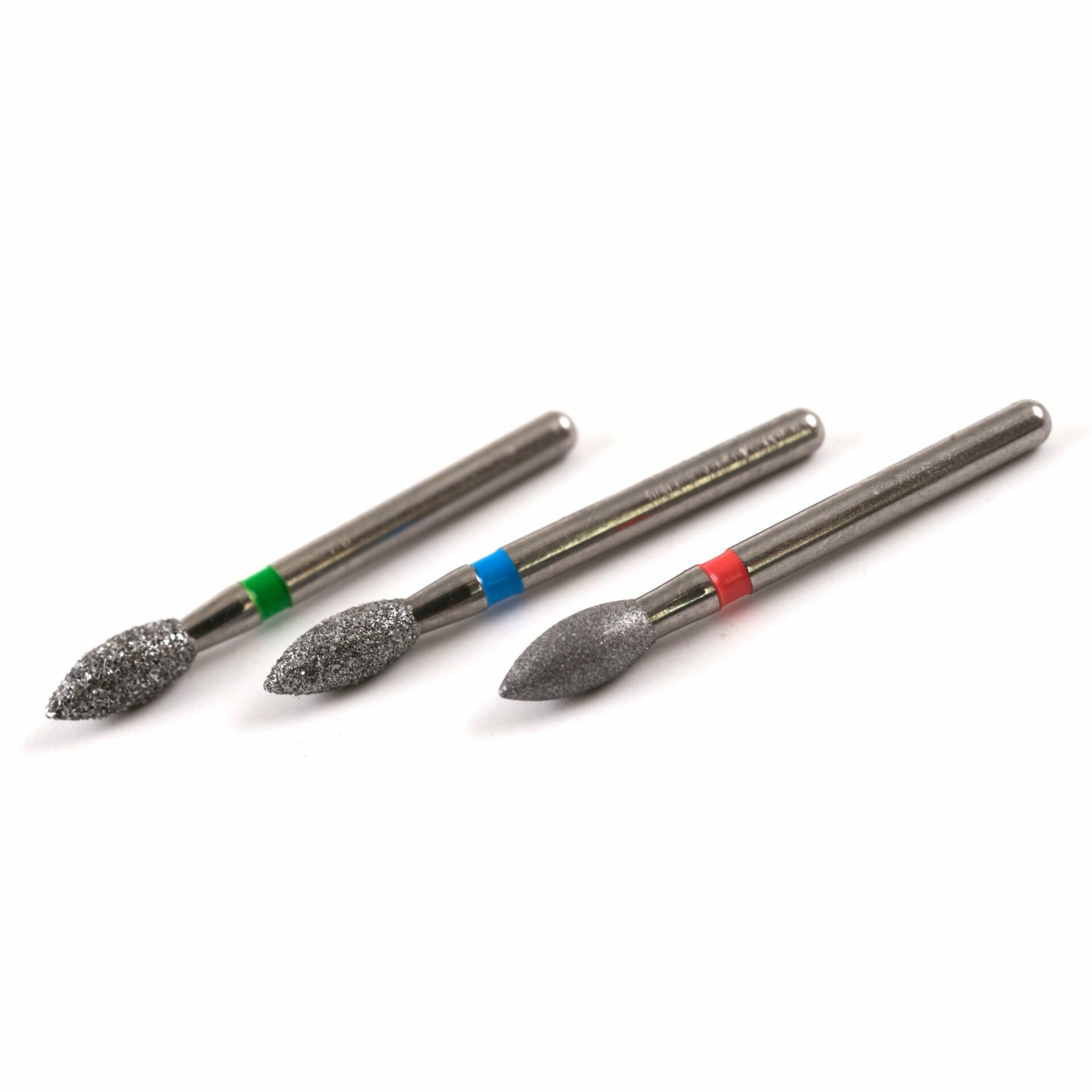 Fraises diamantées, forme « olive pointue » (« Rugby »), pour traitement de préparation en cabinet dentaire.